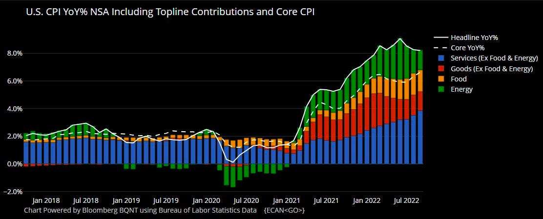 Looking at the contributors to US CPI, it can be seen that the continued rise has been largely driven by an increase in services (although to be fair, every other component apart from energy has contributed to the CPI reading). Here is a view of how prices have changed compared to last year
